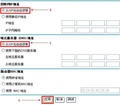 选择菜单“设置”——>“基本设置”——>“您的因特网连接需要登录吗”选择:是——>“因特网服务提供商”选择PPPoE——>在“登录”和“密码”后面的空白栏中分别输入:宽带的帐号、宽带密码——>“因特网IP地址”选择:从ISP处动态获取——>点击“应用”如下图: